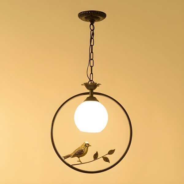 Whimsical Bird & Branch Pendant Light Fixture with Frosted Glass Globe - 110V-120V Black