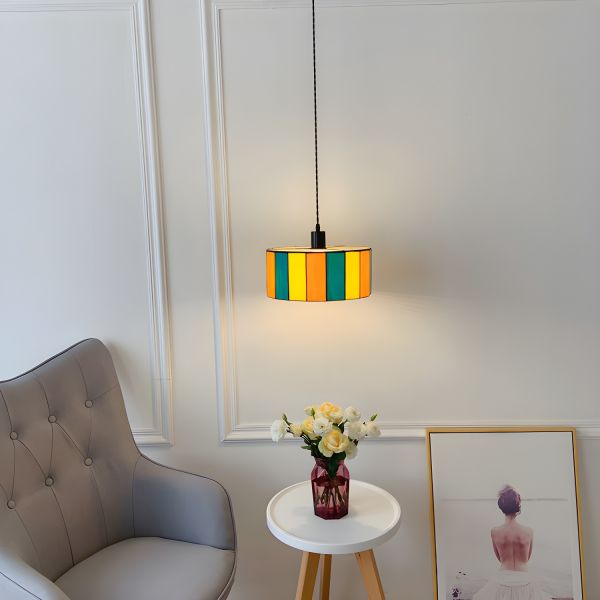 Retro Stained Glass Drum Pendant Light with Colorful Geometric Stripes for Kitchen and Bar - 110V-120V