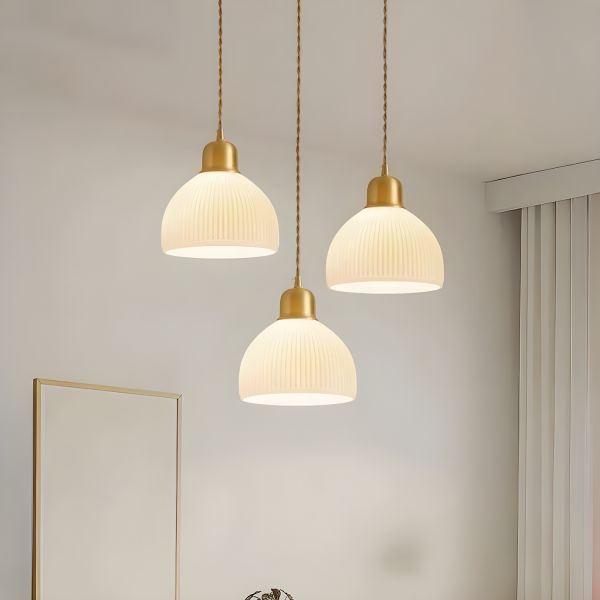 Vintage Pleated Pendant Light, Solid Brass Hanging Lamp with Rotary Switch for Kitchen Island - 3 White 110V-120V