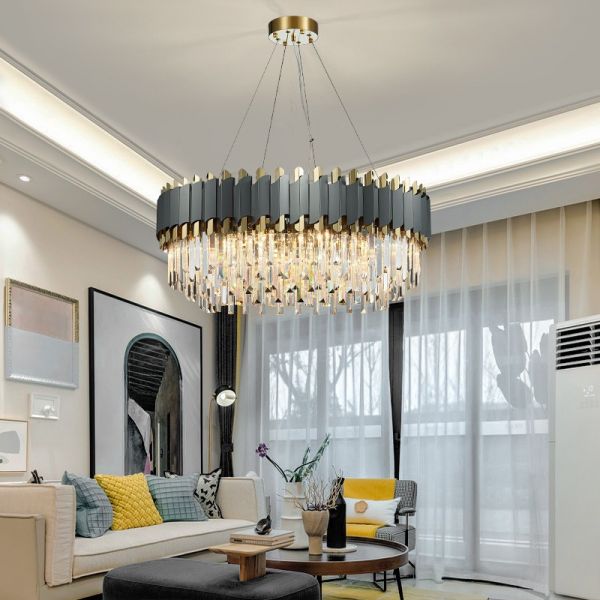 Contemporary Art Deco Crystal Chandelier, Matte Grey and Gold Drum Pendant Light with Prism Accents - 110V-120V 23.5"