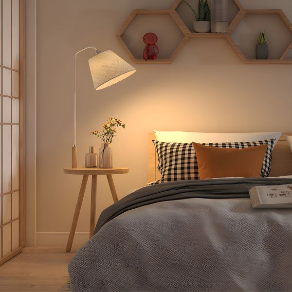 Scandinavian Solid Wood Tripod Floor Lamp with Built-in Side Table and Fabric Shade - 110V-120V