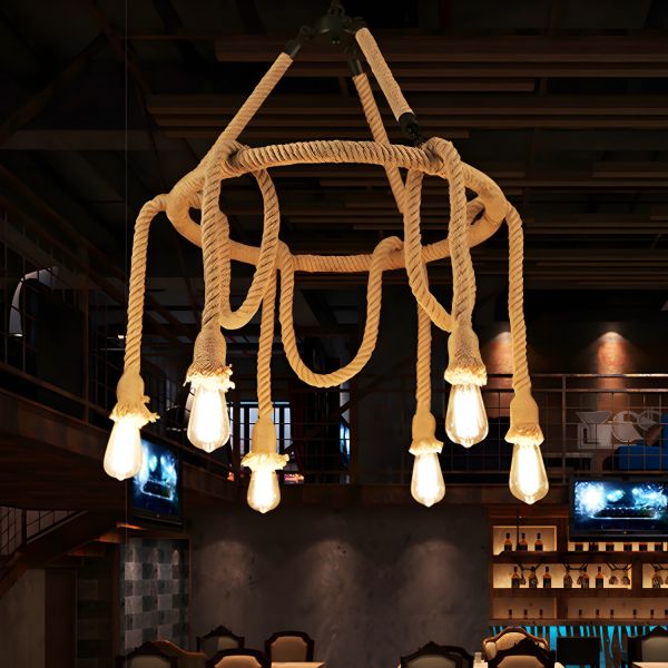 Rustic Industrial Hemp Rope Chandelier Round Pendant Lighting - 110V-120V Beige 6