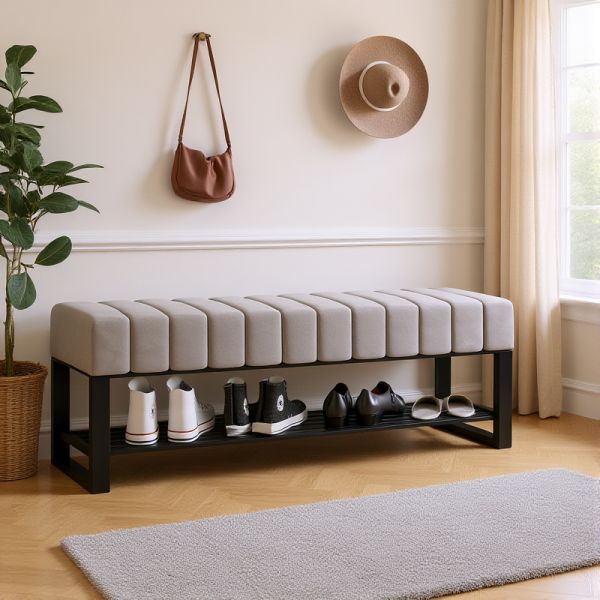 Modern Upholstered Entryway Shoe Bench, Padded Seat with Metal Frame and Lower Storage Rack