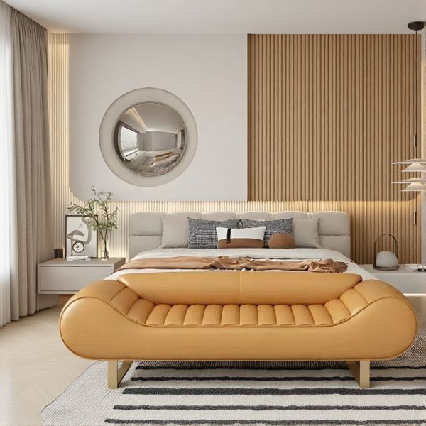 Modern Curved Leather End-of-Bed Bench with Channel Tufting and Metal Legs, Upholstered Bedroom