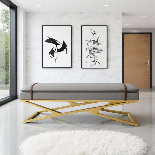 Contemporary Gray Bench Ottoman with Faux Leather Seat and Gold Geometric Metal Base for Entryway