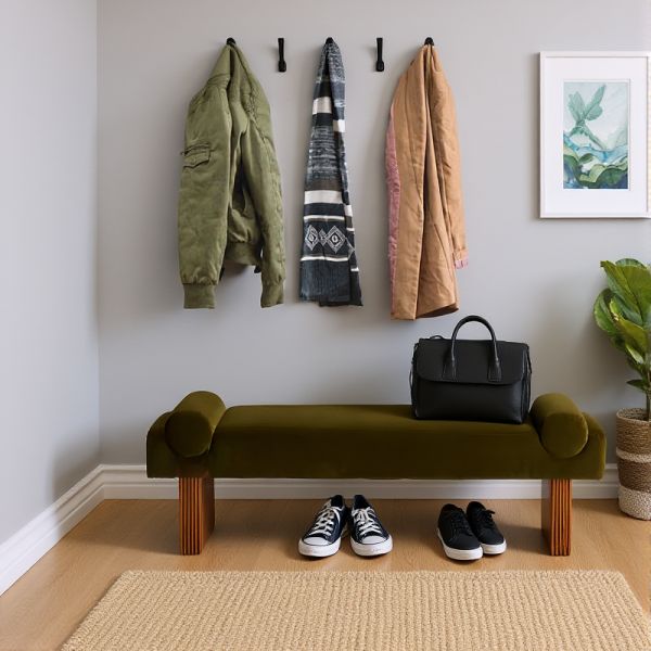 Modern Olive Green Velvet Bench with Bolster Ends and Fluted Wood Legs for Entryway or Bedroom