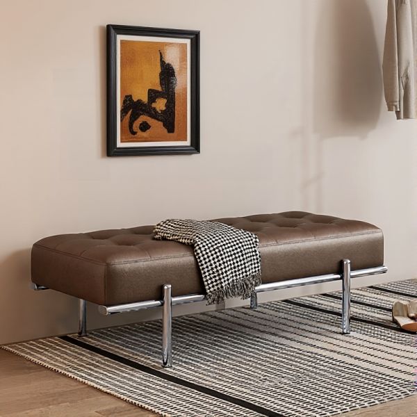 Brown Tufted Faux Leather Bench with Chrome Legs, Modern Rectangular Entryway Ottoman