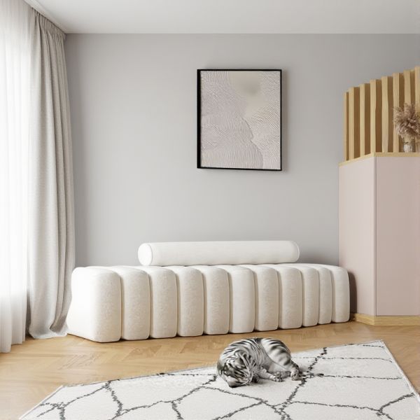 Modern Cream Upholstered Channel-Tufted Bench Sofa with Cylindrical Bolster for Living Room