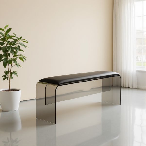 Minimalist Rectangular Tempered Glass Bench with Black Cushioned Seat, Clear Entryway Hall Seating