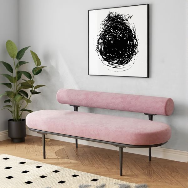 Modern Pink Velvet Upholstered Bench with Cylindrical Backrest, Metal Frame, Entryway/Living Room