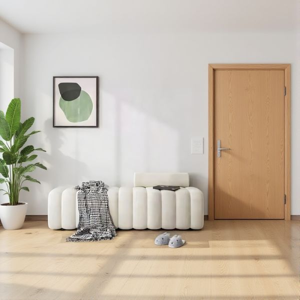 Modern Boucle Upholstered End-of-Bed Bench, Plush Tufted Bedroom Ottoman in Cream