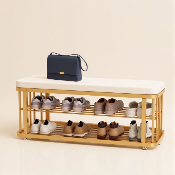 Blush Pink Upholstered Entryway Bench with Gold Metal 3-Tier Shoe Rack Storage Seat