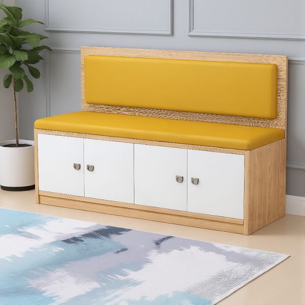 Modern Entryway Shoe Storage Bench with Padded Seat & Back, Wood Frame, White Cabinet Doors