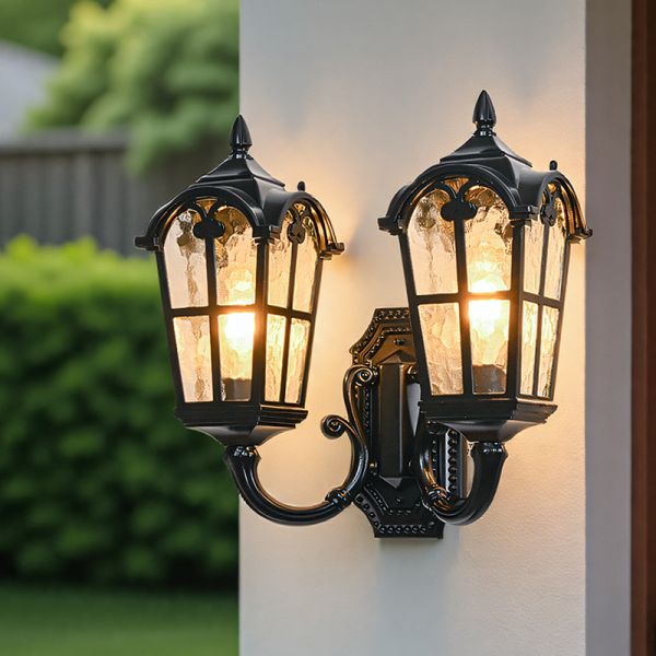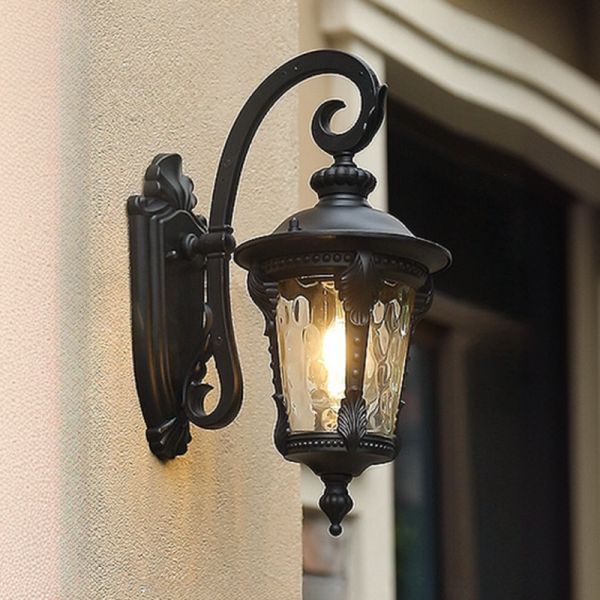 Traditional Outdoor Wall Sconce, Die-Cast Aluminum Lantern with Water Glass Shade for Porch and Patio - Black 110V-120V 16.5"