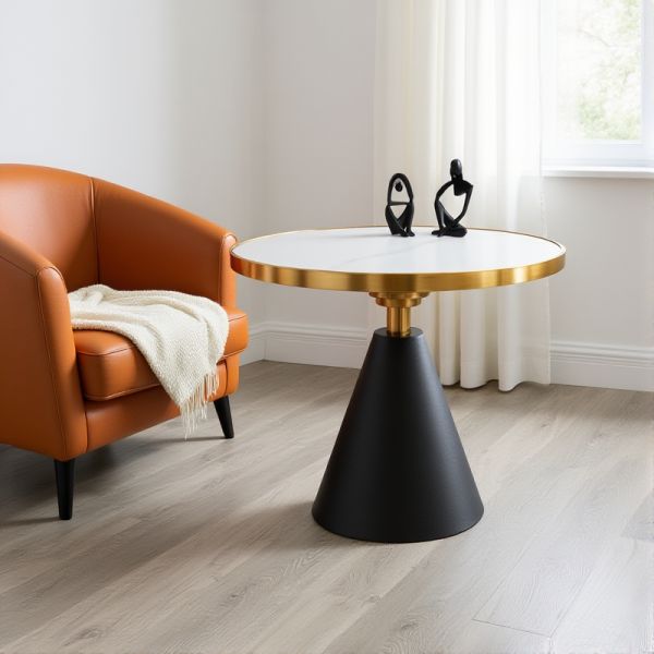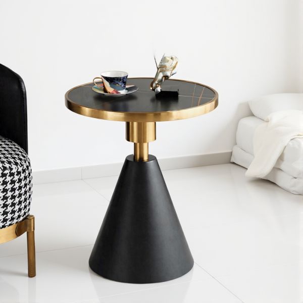 Round Black Marble-Style End Table with Gold Rim and Cone Base, Modern Accent Side Table for Living - Black/Gold 20"L x 20"W x 23"H