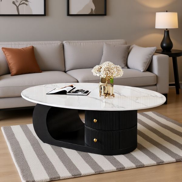 Modern Oval Faux Marble Top Coffee Table with 2 Storage Drawers, Sculptural Base Living Room Center - Black 39"L x 22"W x 16"H Gloss White