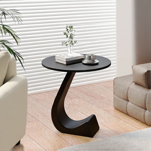 Round 2-Tier Marble-Look End Table with Shelf, Modern C-Shaped Side Table, Metal Base for Living - Black