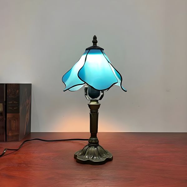 Vintage Tiffany Style Stained Glass Table Lamp, Handcrafted Art Glass Nightstand Light with Antique Finish Bronze Base - 110V-120V Blue