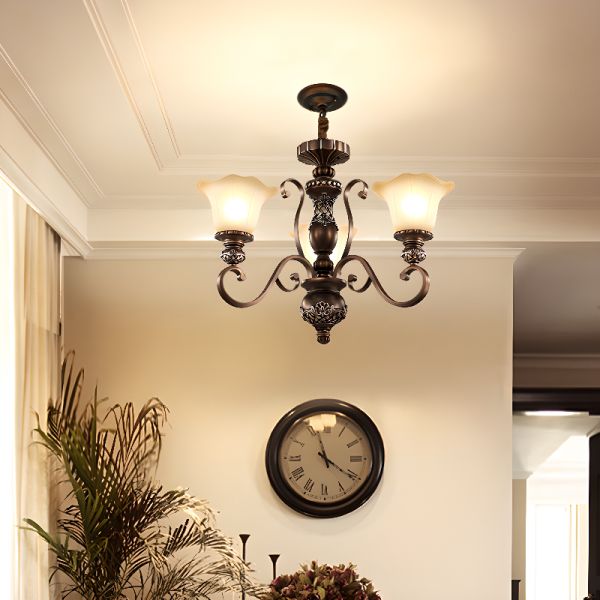 Vintage Traditional Bronze Chandelier with Frosted Glass Shades and Ornate Scroll Details - 3 110V-120V Bud