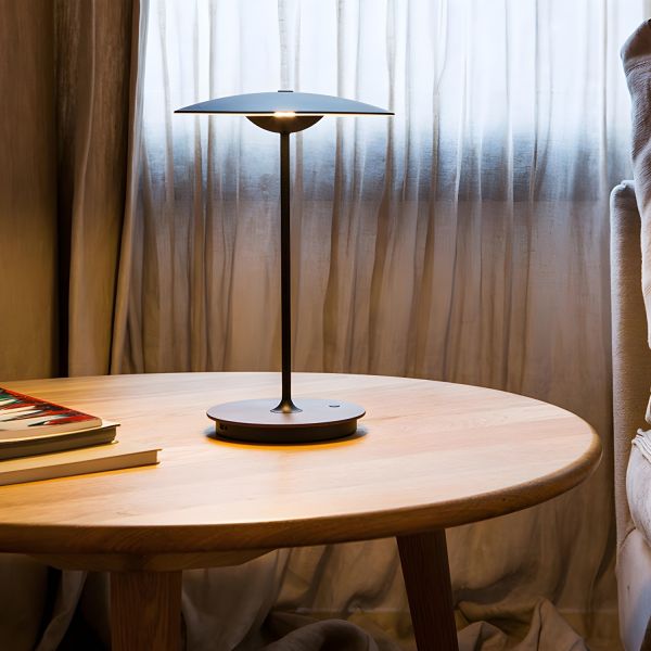Scandinavian LED Table Lamp with Flat Circular Shade - Minimalist Indirect Lighting Fixture for Bedroom, Living Room, and Office - 110V-120V Black 12"