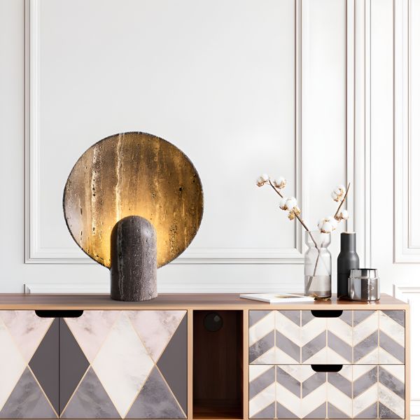 Wabi-Sabi Faux Travertine Table Lamp, 9" Organic Geometric Circle Ambient Light for Bedroom - 110V-120V