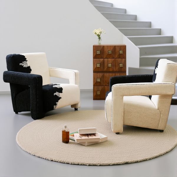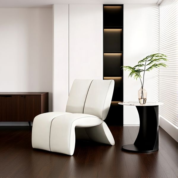 Modern Accent Armchair, Cream Faux Leather Upholstery with Padded Cylindrical Arms and Black Angled