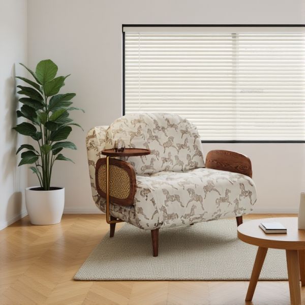 Mid-Century Accent Chair with Attached Side Table, Wood Arms & Cane Panel, Horse Print Upholstery