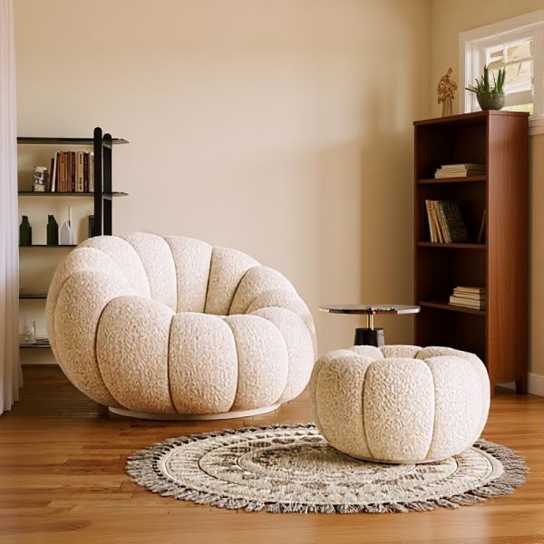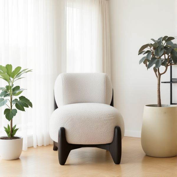 Modern Boucle Upholstered Armless Lounge Chair with Curved Back, Deep Seat and Dark Wood Base