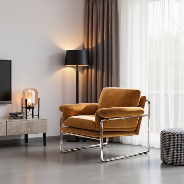 Mid-Century Lounge Armchair with Chrome Metal Frame, Thick Cushions, Faux Suede Accent Chair