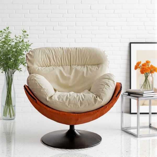 Swivel Bowl Lounge Chair with Plush Cream Cushion, Faux Leather Shell & Black Pedestal Base