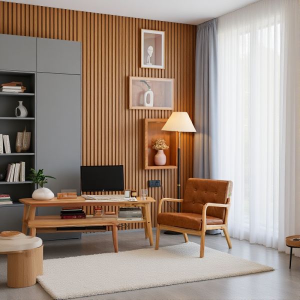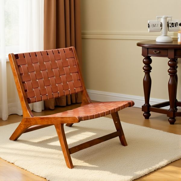 Mid-Century Woven Leather Strap Lounge Chair, Solid Wood Accent Seat for Living Room