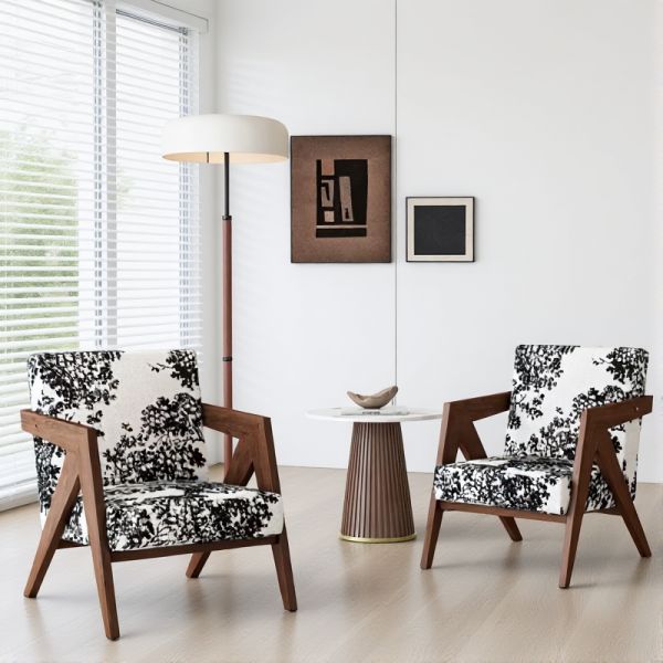 Mid-Century Solid Wood Accent Chair with Armrests, Green Fabric Cushions, Living Room Lounge Seat