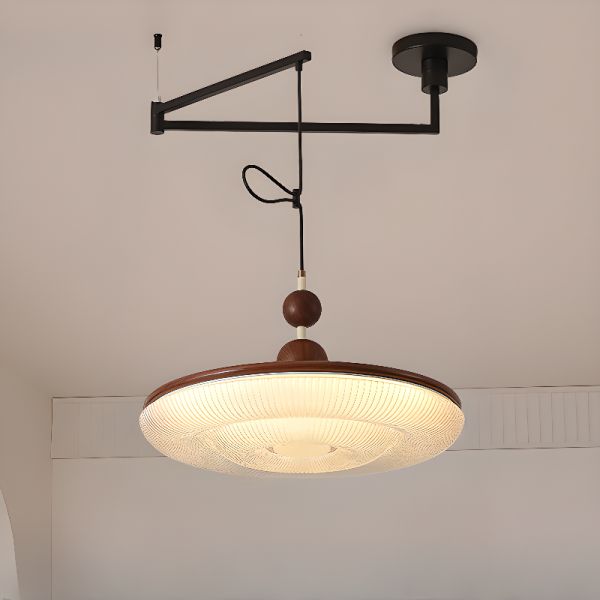 Simplistic 1 Light Wood-Toned Rectilinear Vitreous Ceiling Lamp with Lampshade and Variable Suspension Length, 110V-120V, Circle