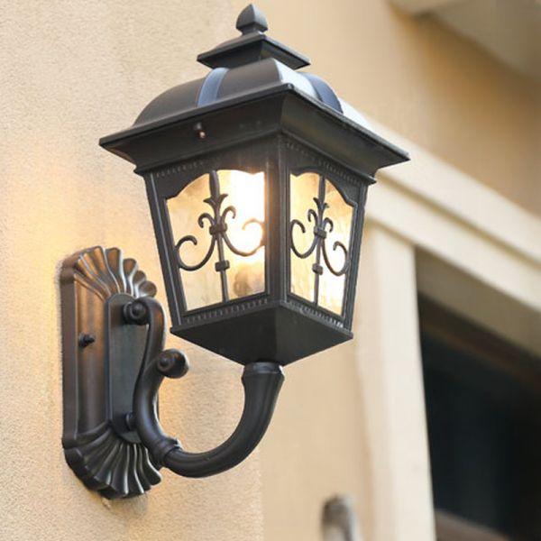 Victorian Style Outdoor Wall Light Fixture, Weather Resistant Porch Lantern with Ornate Scroll Arm - Black Up 110V-120V 16"