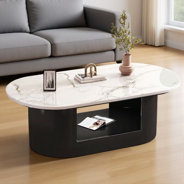 Oval Coffee Table with Faux Marble Tempered Glass Top, Open Shelf Storage, Modern Living Room - Black 39.5"L x 19.5"W x 18"H White/Gray