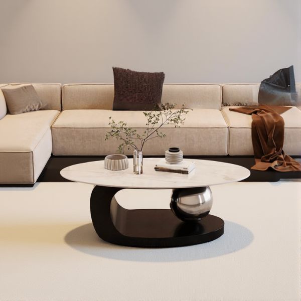 Contemporary Oval Coffee Table, Matte Black Pebble Top with Pedestal Base, Low-Profile Living Room - Black 39"L x 22"W x 16"H