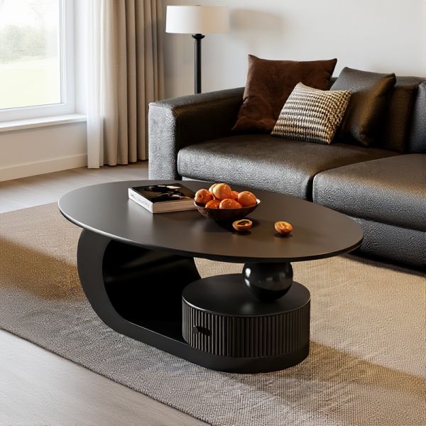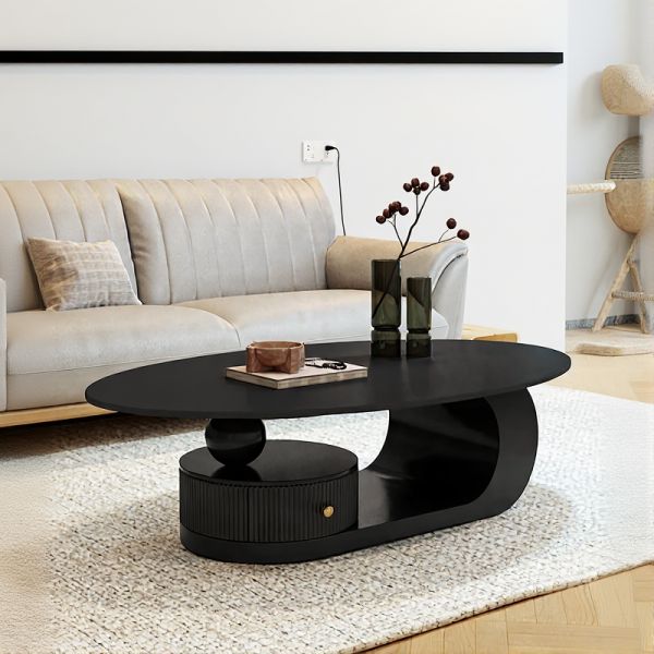 Modern Oval Coffee Table in Matte Black, Wood Center Table with Drawer and Open Shelf Storage - 47"L x 24"W x 16"H
