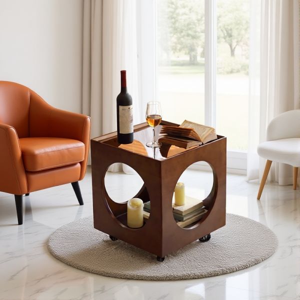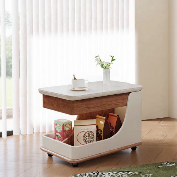Rolling end table with storage, marble-look tempered glass top, sofa side cart on casters - Brown White