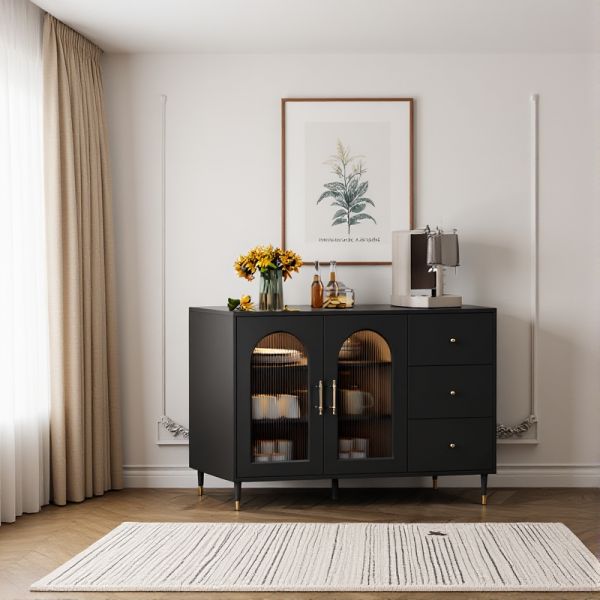 Contemporary Black Buffet Sideboard with Arched Fluted Glass Doors, 3 Drawers & Gold Hardware - 47"L x 16"W x 35"H