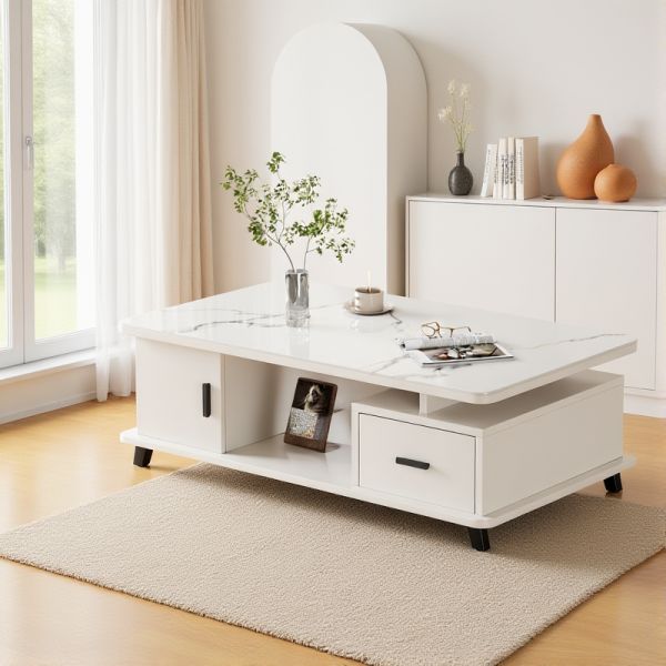 Modern Rectangular Coffee Table with White Tempered Glass Marble Top, Drawer, Cabinet & Open Shelf - White 39.5"L x 19.5"W x 16"H Warm White