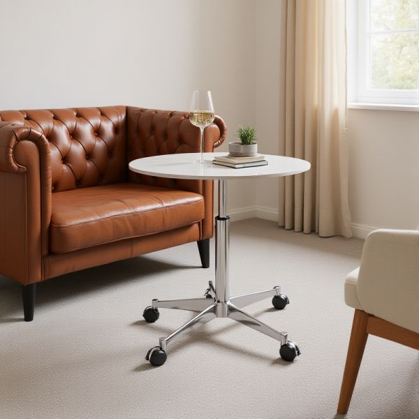 Round White Tempered Glass Coffee Table on Chrome Base with Wheels, Modern Rolling Accent Table - White 26"L x 26"W x 19"H
