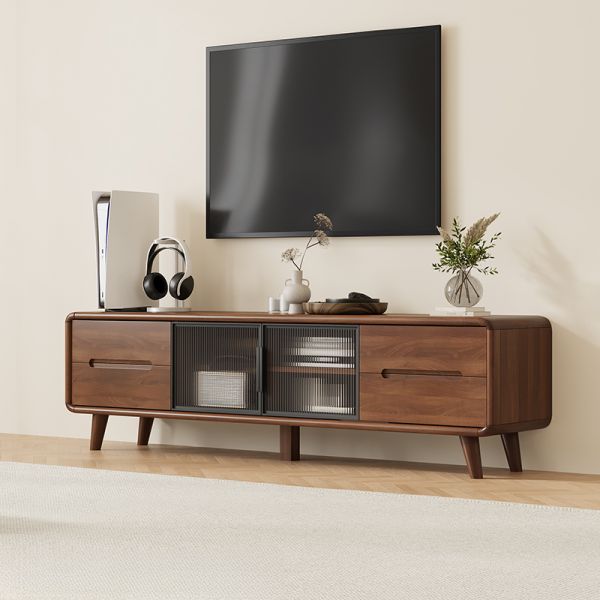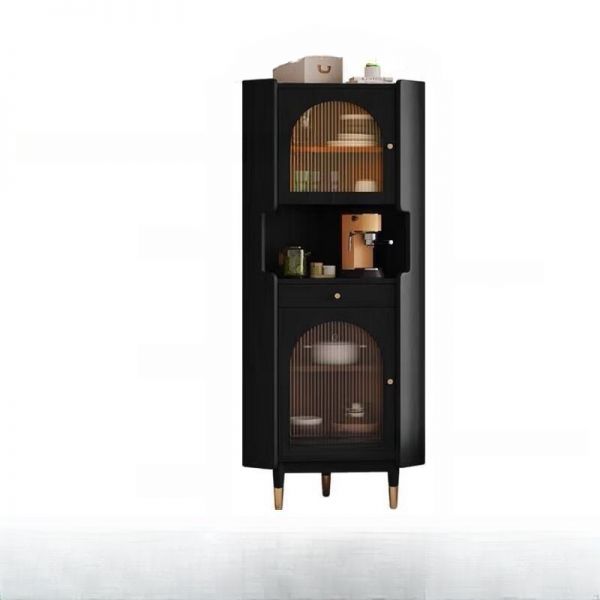 Mid-Century Corner Storage Cabinet, Wood Finish with Fluted Tempered Glass Doors, Drawer & Open - Black