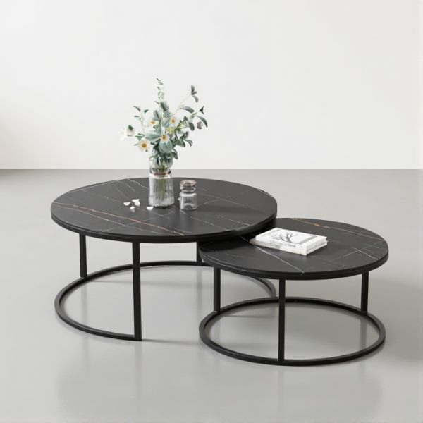 Modern 2-Piece Round Nesting Coffee Table Set, Black Marble-Look Tops, Metal Base, Space-Saving - Black/Gold 24"L x 24"W x 18"H + 18"L x 18"W x 16"H