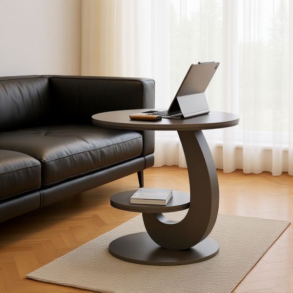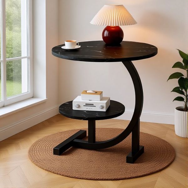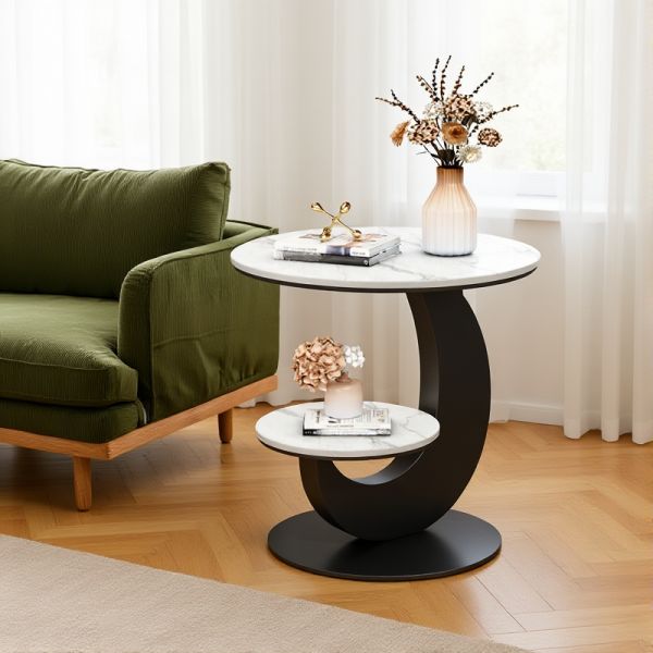Round 2-Tier Marble-Look End Table with Shelf, Modern C-Shaped Side Table, Metal Base for Living - Black