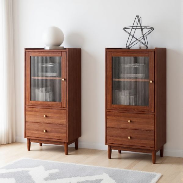 Tall Solid Wood Display Cabinet with Fluted Glass Door, 3 Shelves & 2 Drawers, Slim Storage - 17"L x 14"W x 41"H Nut/Brown