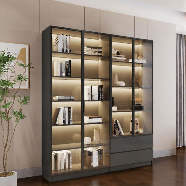 Tall LED-Lit Glass Door Display Cabinet, Modern Bookcase with Open Shelves and 2 Bottom Drawers - 47"L x 13"W x 79"H