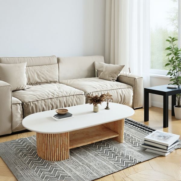 Scandi Oval Coffee Table, White Top & Natural Wood Double Pedestal Base, Minimalist Living Room - Shelves Included White/Wood 39.5"L x 19.5"W x 16"H