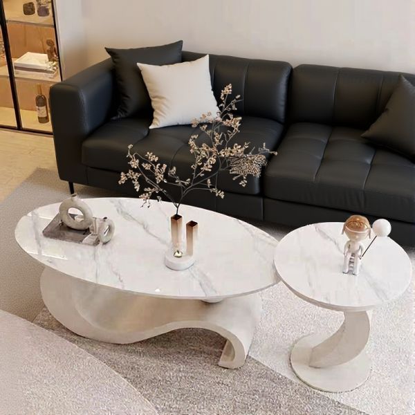Modern Oval White Coffee Table with Faux Marble Top, Curved Sculptural Base Centerpiece for Living - White/Grey 39"L x 22"W x 18"H+20"L x 20"W x 20"H