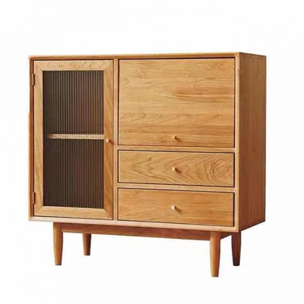 Wood Sideboard Buffet with Ribbed Glass Door and Drawers, Compact Storage Cabinet for Living Room - Natural Finish 39"L x 16"W x 37"H