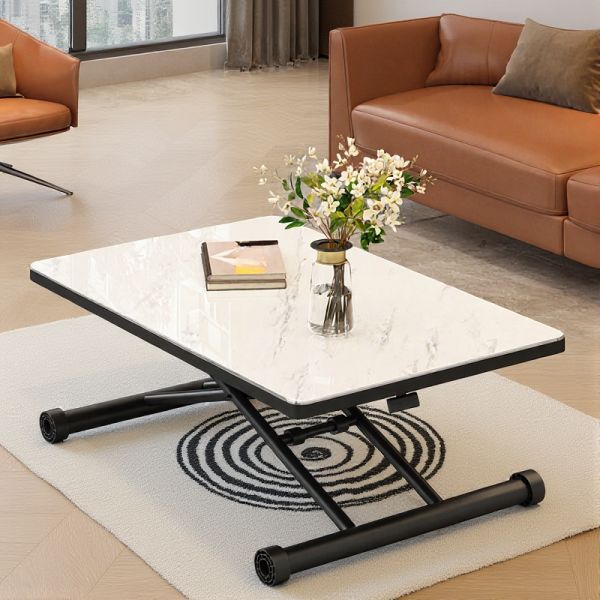 Rectangular Height-Adjustable Coffee Table with Faux Marble Tempered Glass Top, Metal X-Base, - White 35.5"L x 23.5"W x 28"H